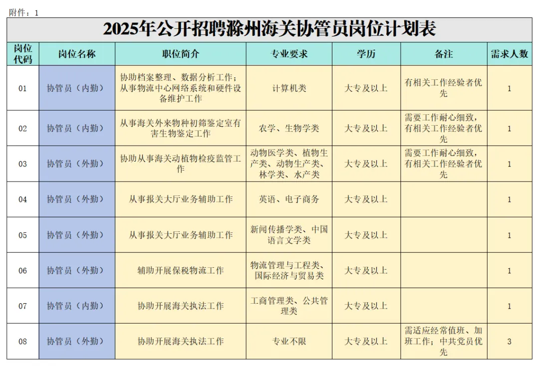 具体岗位及要求见附件《2025年公开招聘滁州海关协管员岗位计划表》(附件1)。