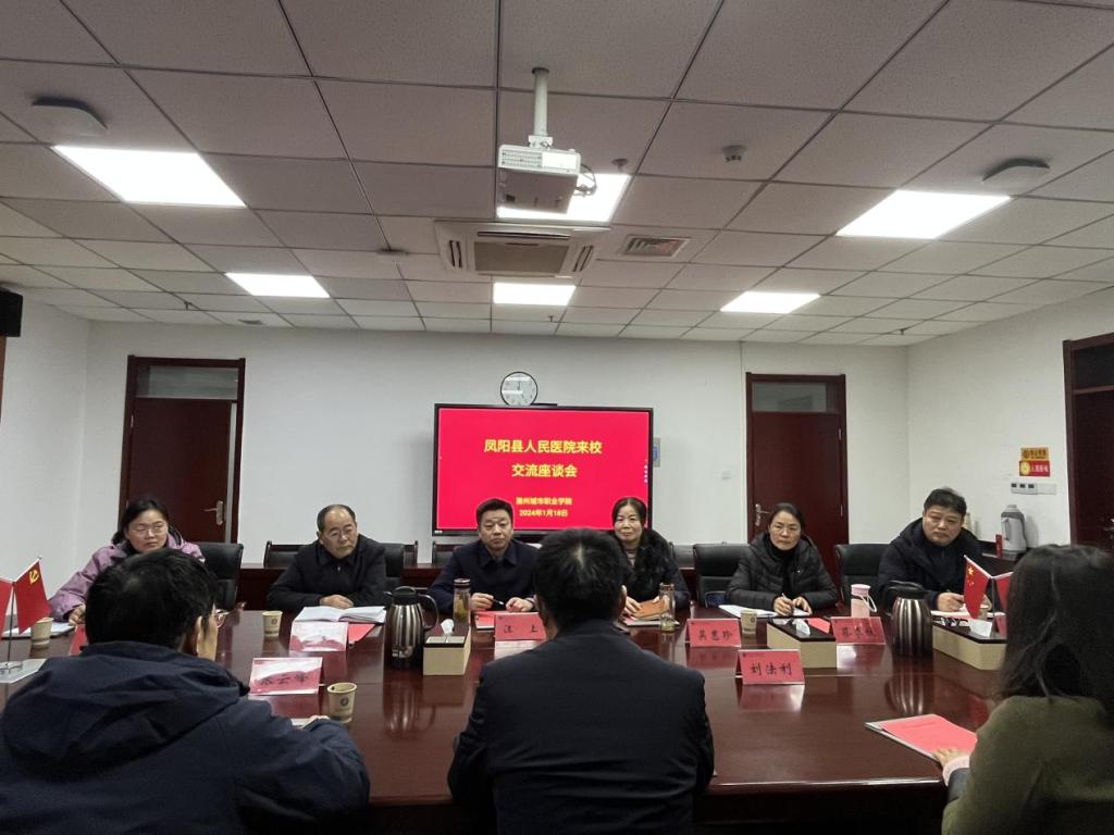 1月18日,凤阳县人民医院院长傅继荣,副院长张云峰,科教科科长刘法利一行来我校开展交流座谈。党委副书记、校长汪上,校党委委员、副校长吴惠珍,教务处处长戴锦明,护理学院党总支书记蔡季秋,医学院党总支书记周慧,科技处处长杜裕民参加了此次座谈。