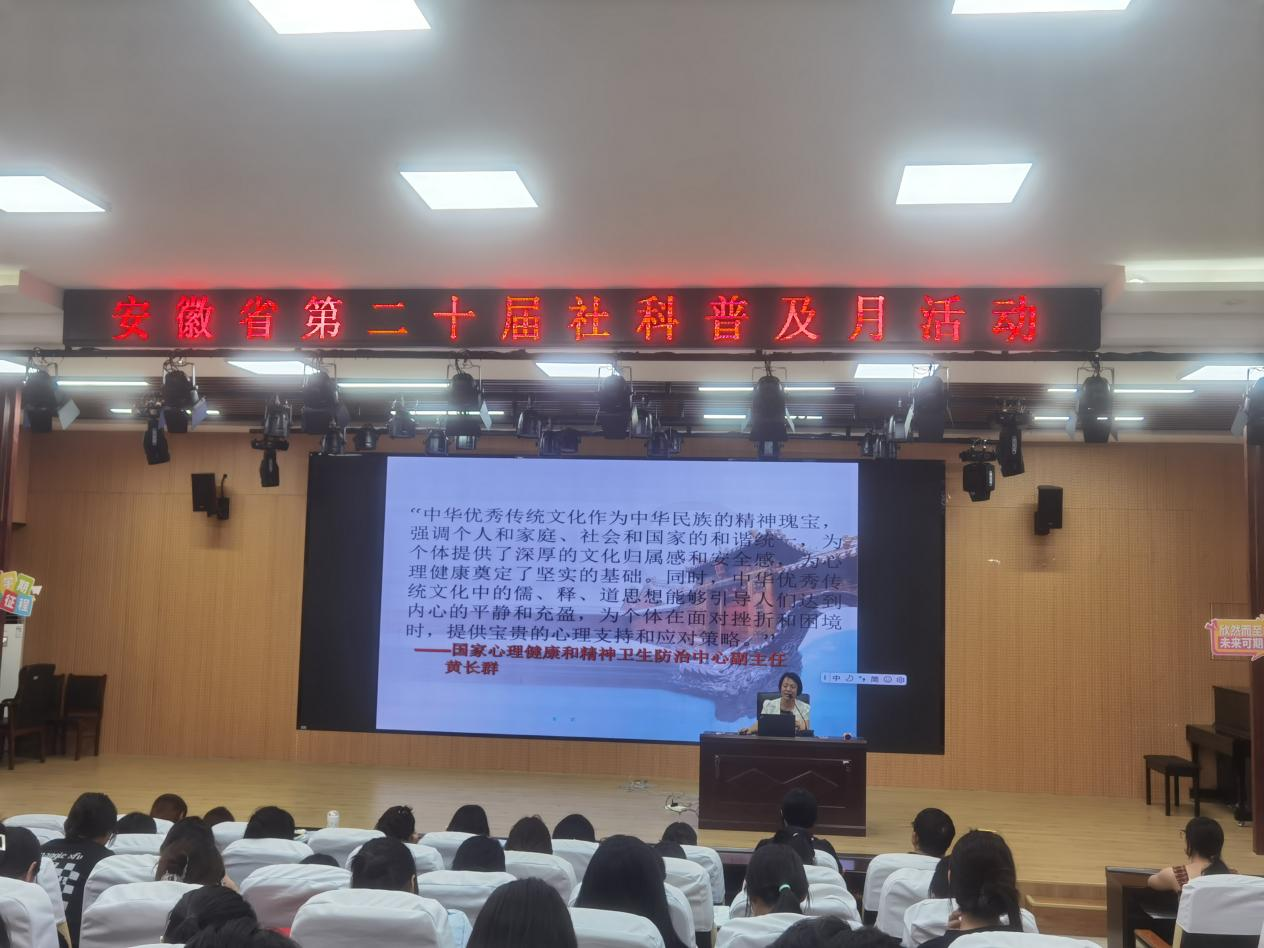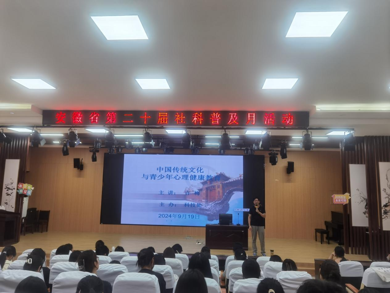 为响应安徽省第二十届社科普及月活动的部署,积极推进我校大学生心理健康教育的开展,2024年9月19日下午,继续教育学院院长许梅应邀在教育学院报告厅为小学教育、学前教育专业的同学们开展了“中国优秀传统文化与青少年心理健康教育”的专题讲座,讲座由科技处副处长田兆山主持。