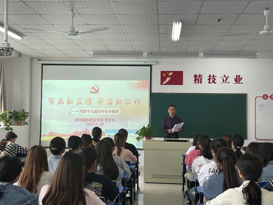 5月20日下午,学院党委委员、副院长曹士东为教育系20小教高专3班全体同学讲授《形势与政策》课程第一讲《擘画新蓝图开启新征程——党的十九届五中全会解读》。
