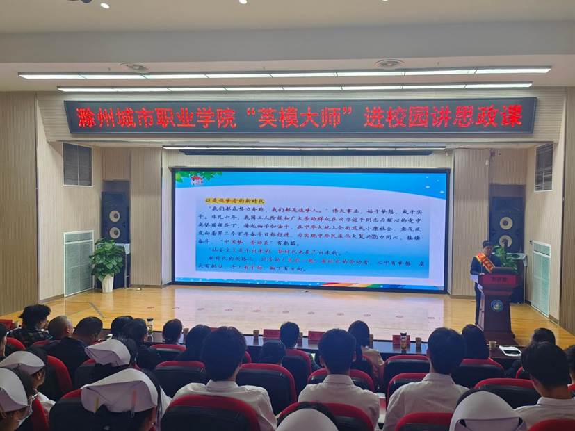 为深入学习贯彻党的二十大精神,深入开展学习贯彻习近平新时代中国特色社会主义思想主题教育,落实教育部等十部门关于印发《全面推进“大思政课”建设的工作方案》,激励和鼓舞大学生传承劳模精神、弘扬工匠精神,把劳模精神融入大思政课,创新思政课教育形式,5月11日下午,我校联合滁州市总工会在图文中心四楼报告厅举办“凝心铸魂跟党走 团结奋斗新征程”劳模宣讲暨“英模大师”进校园讲思政课活动。活动邀请了全国五一劳动奖章获得者、滁州市第一人民医院呼吸与危重症医学科二病区主任、副主任医师芮晓燕,安徽省先进工作者、琅琊区教育体育局工委委员、教研室主任曹文龙,为师生们讲了一堂别开生面的“大思政课”。滁州市关工委副主任朱荣、校党委副书记牛春雨出席活动,各部门负责同志、思政课教师、团干、青年学生共200余人参加活动。活动同时通过网络“云端”同步直播,引起青年学子热烈反响。