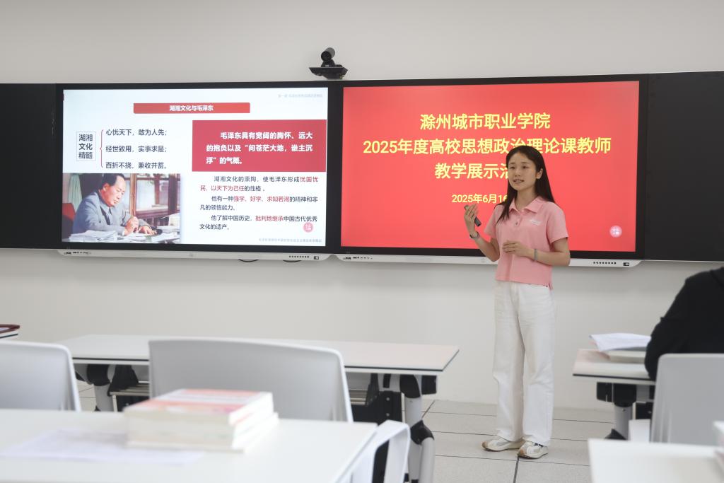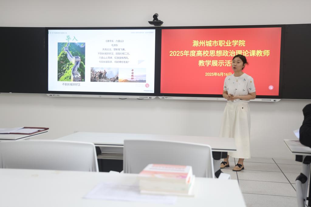 为深入贯彻落实习近平总书记关于学校思想政治理论课建设的重要指示精神,进一步提升教师教学能力,练就教书育人本领,6月16日,学校在静思楼三楼教学创新中心举办2025年思政课教师教学展示活动。此次活动邀请滁州学院马克思主义学院党委副书记、副院长张静,副院长郑爱龙,教学督导组组长路德红担任评委,我校党委书记王燕永,党委副书记、校长汪上,校党委副书记牛春雨,党委委员、副校长曹士东,教务处处长戴锦明莅临现场指导。