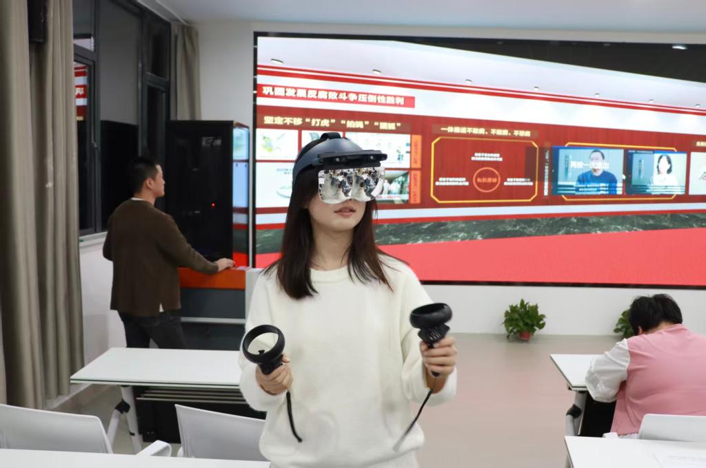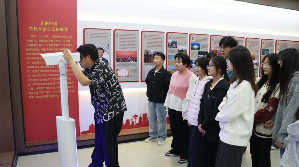 沉浸体验环节成为理论学习的生动课堂,指导老师带领新社员系统了解核心设备的功能,社团骨干手把手指导设备操作及资源调取方法,实时解决操作难题。社员们走进线上红色场馆、重温长征革命历程,在党史知识问答中巩固理论要点。思政教育通过科技手段转化为可感、可触、可参与的实践内容。