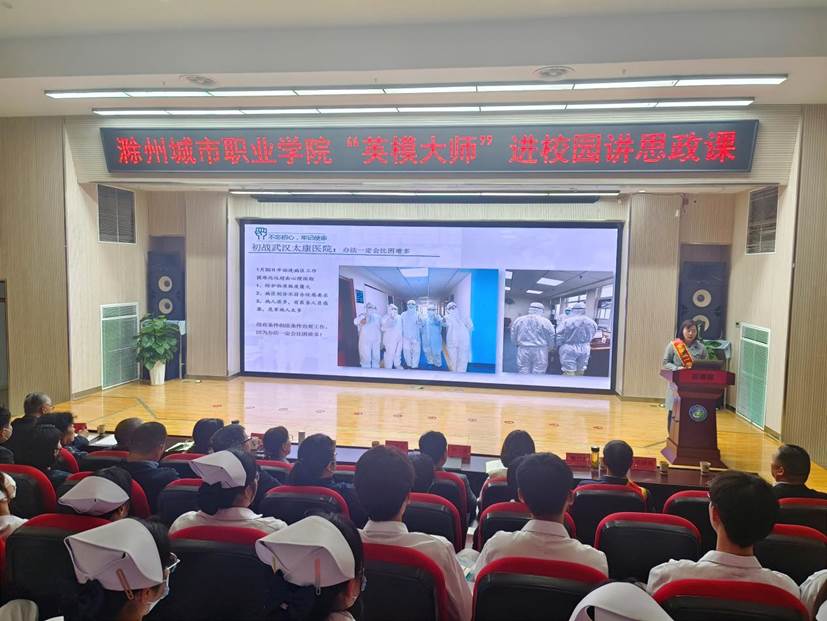 为深入学习贯彻党的二十大精神,深入开展学习贯彻习近平新时代中国特色社会主义思想主题教育,落实教育部等十部门关于印发《全面推进“大思政课”建设的工作方案》,激励和鼓舞大学生传承劳模精神、弘扬工匠精神,把劳模精神融入大思政课,创新思政课教育形式,5月11日下午,我校联合滁州市总工会在图文中心四楼报告厅举办“凝心铸魂跟党走 团结奋斗新征程”劳模宣讲暨“英模大师”进校园讲思政课活动。活动邀请了全国五一劳动奖章获得者、滁州市第一人民医院呼吸与危重症医学科二病区主任、副主任医师芮晓燕,安徽省先进工作者、琅琊区教育体育局工委委员、教研室主任曹文龙,为师生们讲了一堂别开生面的“大思政课”。滁州市关工委副主任朱荣、校党委副书记牛春雨出席活动,各部门负责同志、思政课教师、团干、青年学生共200余人参加活动。活动同时通过网络“云端”同步直播,引起青年学子热烈反响。