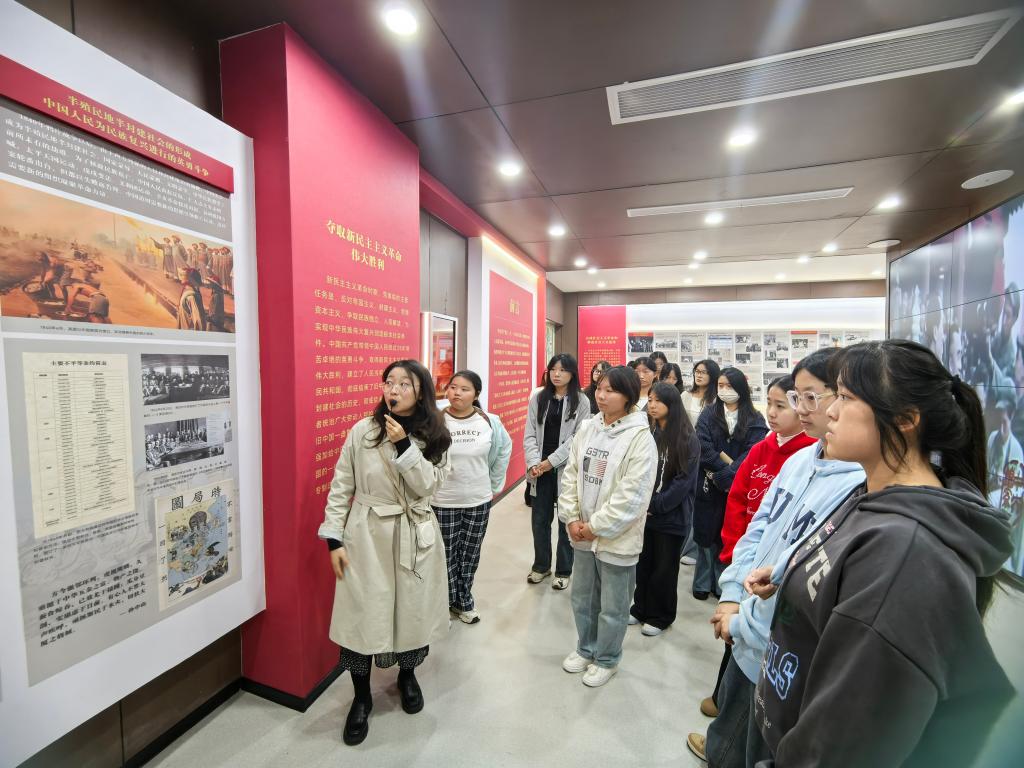 随后,工作人员讲解智慧设备:思政智慧沙盘让学生实景感受不同历史阶段党情党史,VR思政观景台助其“置身”长征行军路体会革命艰辛,思政听读机前学生驻足聆听红色故事、汲取精神力量。