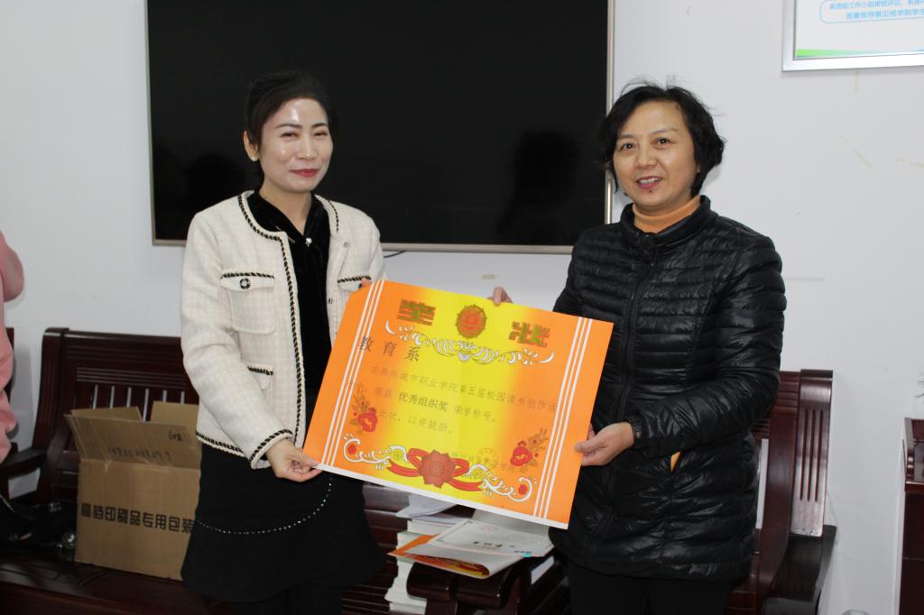 11月9日下午,院党委委员、副院长曹士东在图书馆馆长马琴的陪同下,深入各教学系部,将第五届校园读书创作暨第五届教师“阅读提升”获奖集体、个人的奖状、证书颁发给系部负责人和获奖师生。至此,第五届校园读书创作暨第五届教师“阅读提升”活动圆满落下了帷幕。