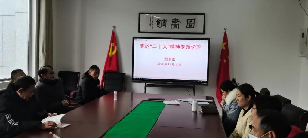 为深入学习贯彻党的二十大精神,教育和引导全体员工不忘初心跟党走、踔厉奋进新征程,2022年11月30日,图书馆组织开展党的二十大精神专题学习,全体馆员参加学习。