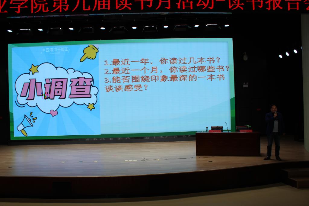 刘亮教授首先从政治、文化、个人发展等各方面充分阐述了读书的重要性,让学生明白:读书可以让我们出言有尺、嬉笑有度、说话有德、做事有余;读书可以让我们的世界变得更辽阔、更宽广;读书改变命运。