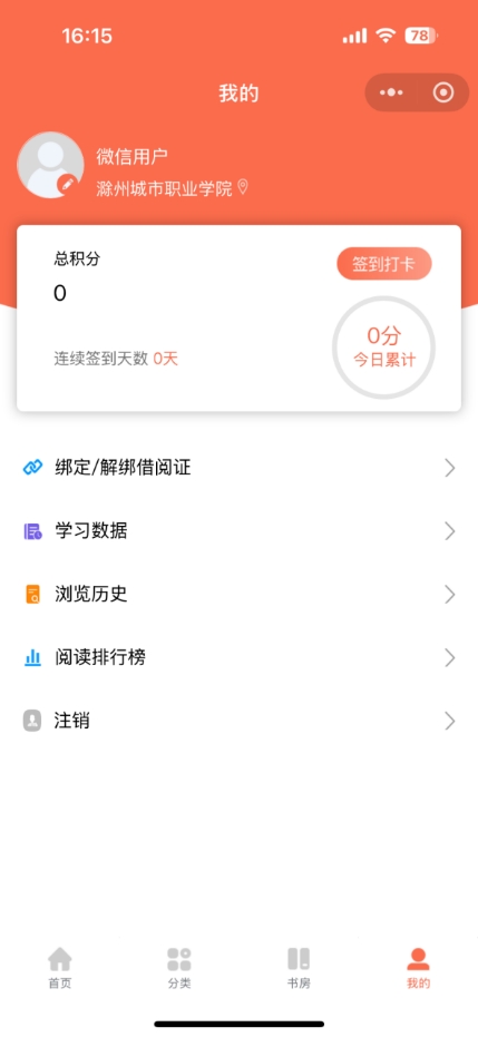 4.显示“微信用户 滁州城市职业学院”即可正常使用。可以通过“首页”、“分类”、“书房”等使用相关资源。