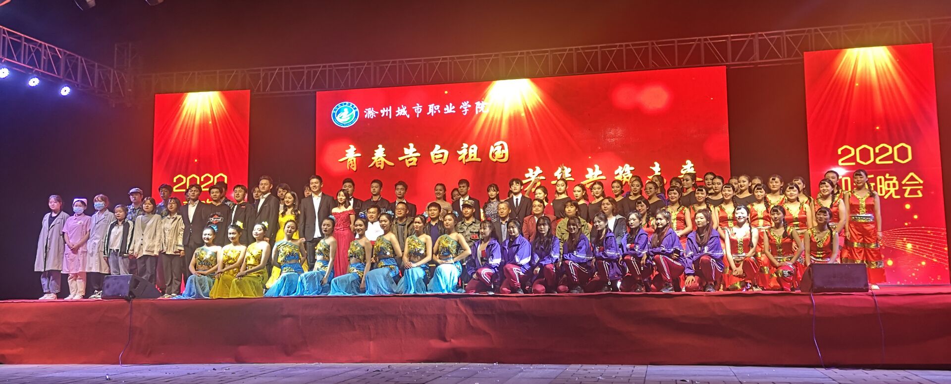 青春告白祖国,芳华共创未来!10月20日,滁州城市职业学院2020年迎新晚会暨第十届科技文化艺术节开幕式在学院南广场隆重举行。学院领导牛春雨、施向阳、曹士东,各部门、系部负责人,承担本次军训任务的全体教官以及2000余名师生欢聚一堂,共同观看了演出。