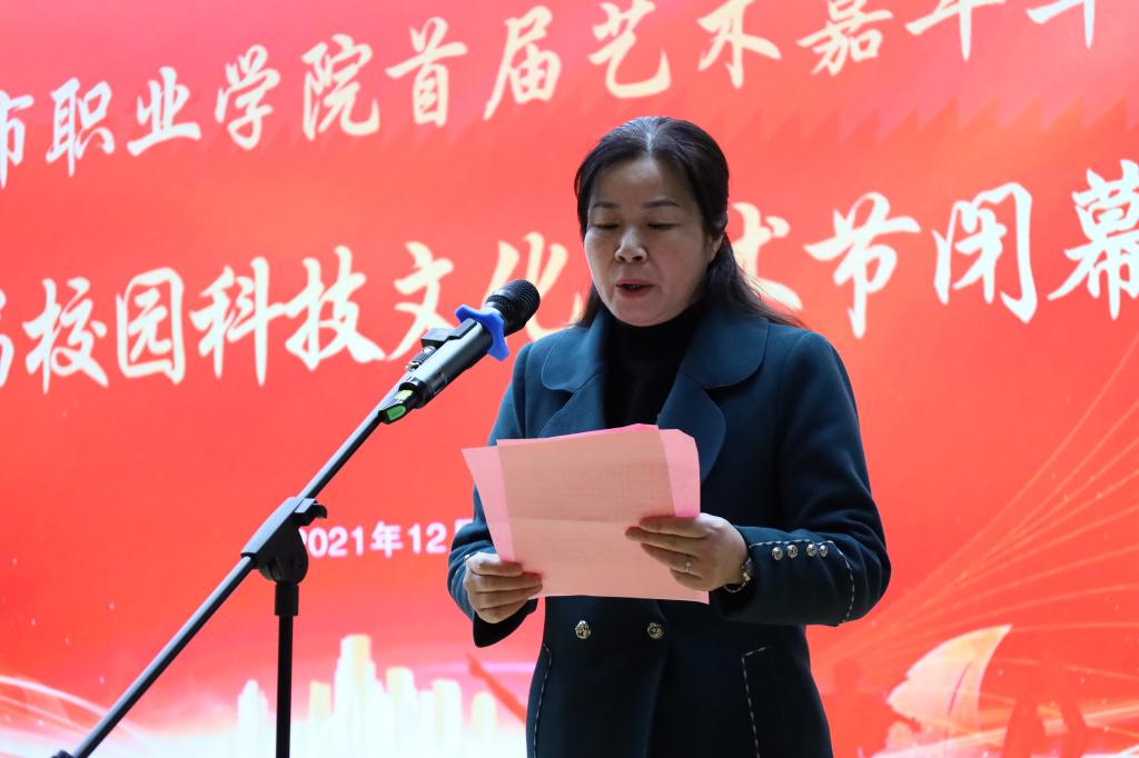 吴惠珍致闭幕词。吴惠珍首先对本届校园科技文化艺术节的圆满成功表示热烈的祝贺,向组织和参与本届校园科技文化艺术节的各位老师和同学们表示衷心的感谢!并引导我校青年学子开拓进取、不断努力,用青春与智慧、激情与活力,为滁州城市职业学院建设技能型高水平大学贡献青春力量!