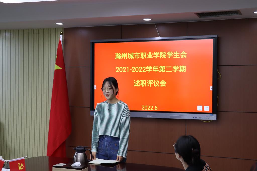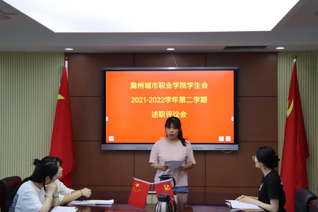 6月7日下午,滁州城市职业学院2021-2022学年第二学期校学生会述职评议大会在图文中心第四会议室举行。述职人员为我校学生会主席团成员及各工作部门主要负责人。校团委副书记陈婷婷、校团委主席团对接人员、校学生会工作人员代表、普通学生代表共计40余人参加了会议。会议由校学生会执行主席张文鑫主持。