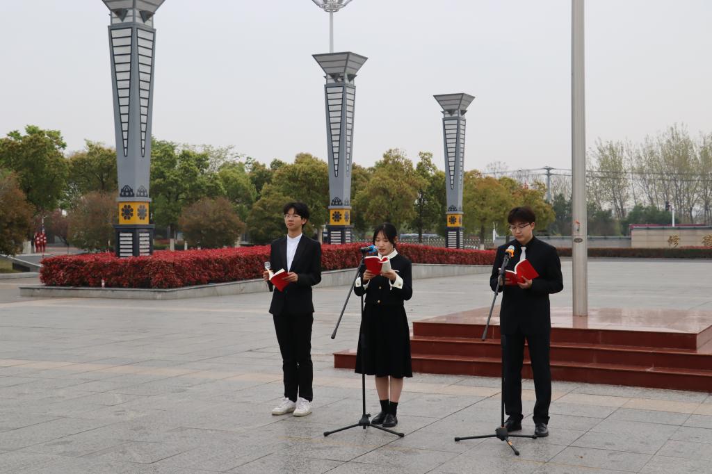 教育学院2022级学前高专10班汤亚轩代表作国旗下的讲话,号召同学们在实现中华民族伟大复兴的征程中,继承先烈遗志,弘扬爱国精神,把爱国之情、报国之志化为实际行动,刻苦学习知识,坚定理想信念,明初心、担使命,争做新时代合格大学生,让红色基因代代相传!