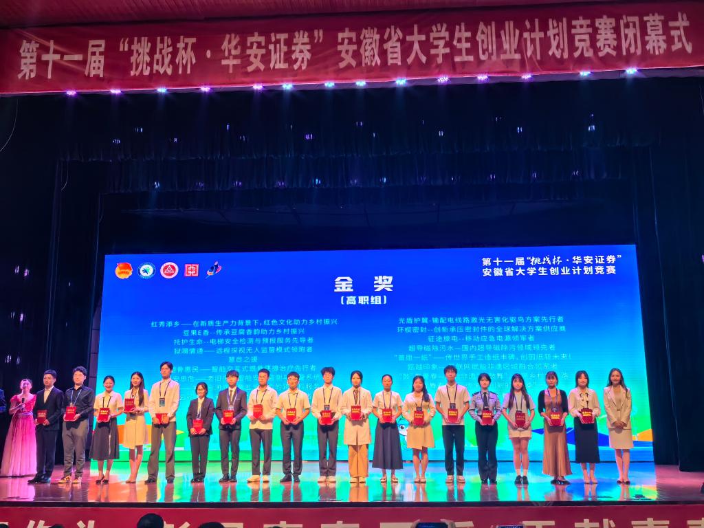 6月18日至20日,由团省委、省教育厅、省人力资源社会保障厅、省科协、省学联、芜湖市人民政府联合主办的第十一届“挑战杯·华安证券”安徽省大学生创业计划竞赛省级决赛在芜湖成功举办。学校11件作品获得佳绩,在入围省级决赛的5件作品中,《红秀添乡——在新质生产力背景下,红色文化助力乡村振兴》、《“鼓”舞青春——赋能非遗“花鼓舞”,点亮乡村振兴路》两件作品斩获金奖,获奖数量和质量创学校历史新高。学校获得优秀组织奖。