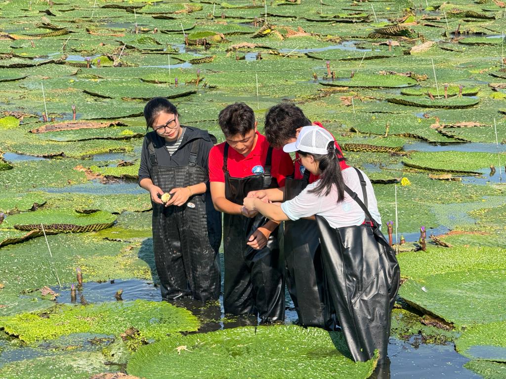 天长市依托抗大八分校旧址这一红色资源与“中国芡实之乡”的绿色产业,形成了独具特色的“红绿融合”发展路径,在长三角一体化进程中发挥着日益重要的作用。作为运河体系重要组成部分的高邮湖,其丰富的水网资源也为天长的芡实种植提供了优越的自然条件。实践团先后走访了天长市白塔湖莲藕芡实专业合作社和天长家厨食品有限公司,深入调研特色农业推动乡村振兴的生动实践,成员们走进千亩芡实种植基地,亲身体验芡实采摘——踏入水田,亲手收获一枚枚包裹尖刺的“水中人参”,在感受农业劳作艰辛的同时,也体会到收获的喜悦。在随后的座谈会上,同学们与企业负责人展开深入交流,围绕芡实深加工产品的市场拓展提出“短视频科普+文旅伴手礼”等创新建议,以青年视角为乡村产业振兴注入新思路、贡献新力量。