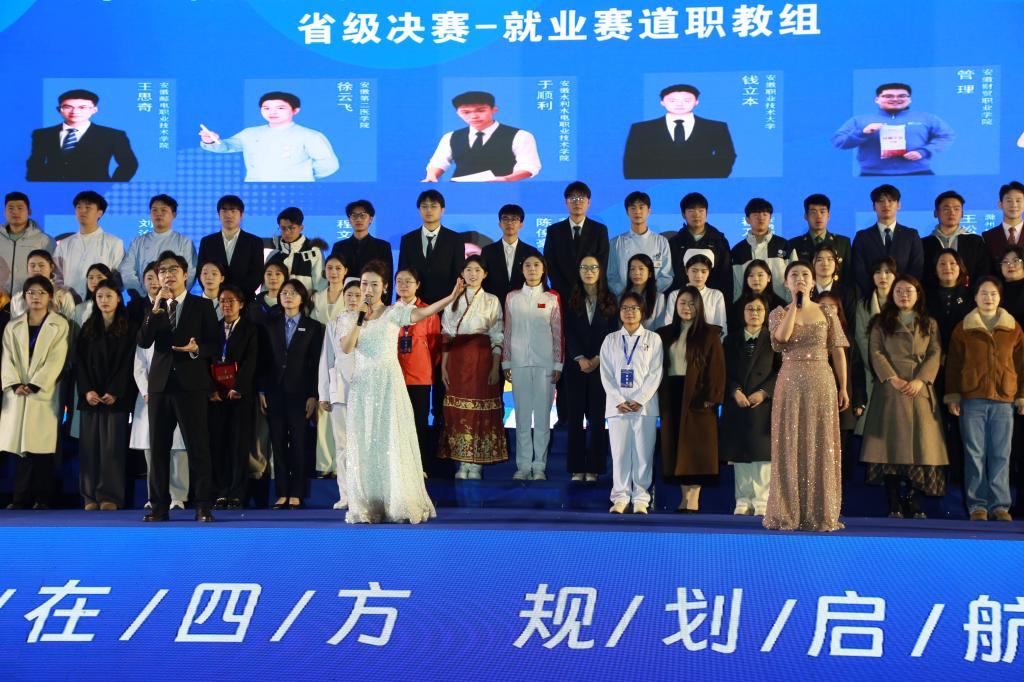 赛事闭幕式上,由我校80余名学生组成的演出团队呈现了涵盖舞蹈、歌曲、朗诵等多种形式的精彩节目。《凤阳花鼓》拉开演出帷幕,铿锵的鼓点与青春的舞步交织,既展现了深厚的文化传承,也敲响了新时代学子奋发向上的精神节拍。原创歌曲《青春的方向》、舞蹈《光亮》、朗诵《青春报告》及职业规划大赛主题曲《追光》等节目依次上演,生动展现了新时代大学生将个人理想融入国家发展的精神风貌。