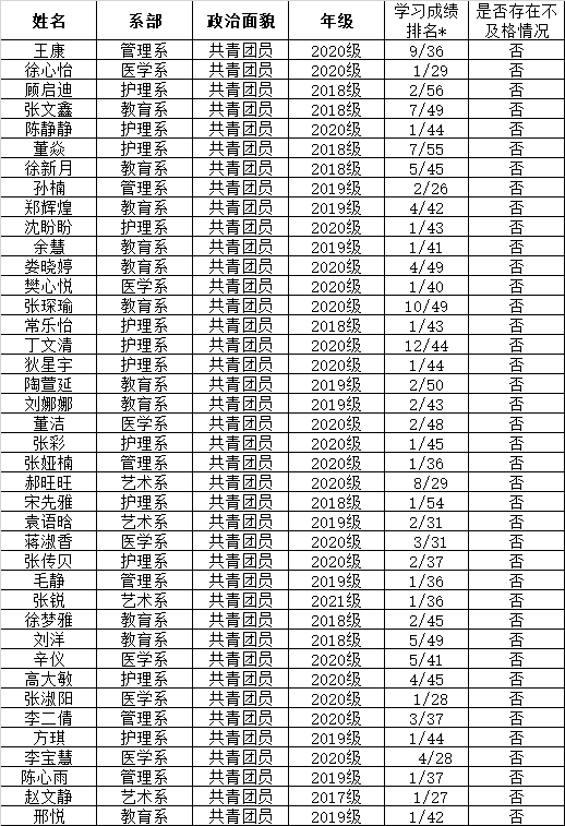 7. 工作人员中除一年级新生外的本专科生最近1个学期/最近1学年/入学以来三者取其一,学习成绩综合排名在本专业前30%以内,且无课业不及格情况;研究生无课业不及格情况。 |