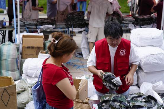 军训物资发放工作高效有序。自管会提前完成清点分装,现场设置清晰指引,志愿者引导新生凭条领取服装鞋帽,并协助试穿调换,以周到服务确保每位新生及时获得合身装备,为军训生活做好充分准备。