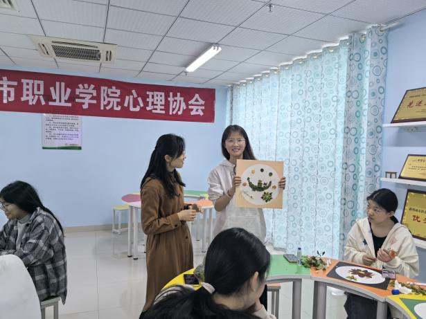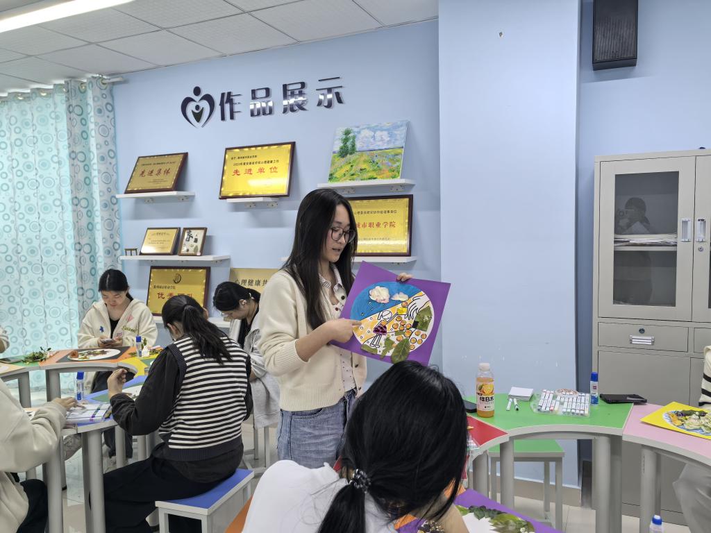 创作结束后,同学们踊跃展示作品、分享创作心境与内心感受,交流氛围热烈温暖。万玲玲老师适时给予专业点评与鼓励,引导大家接纳情绪、肯定自我,在分享中收获心理支持。此次团辅打破传统心理辅导形式,融合自然之美与心灵疗愈。同学们在艺术体验中释放负面情绪,提升了自我接纳与关怀能力,也学会以更积极的心态面对校园生活。