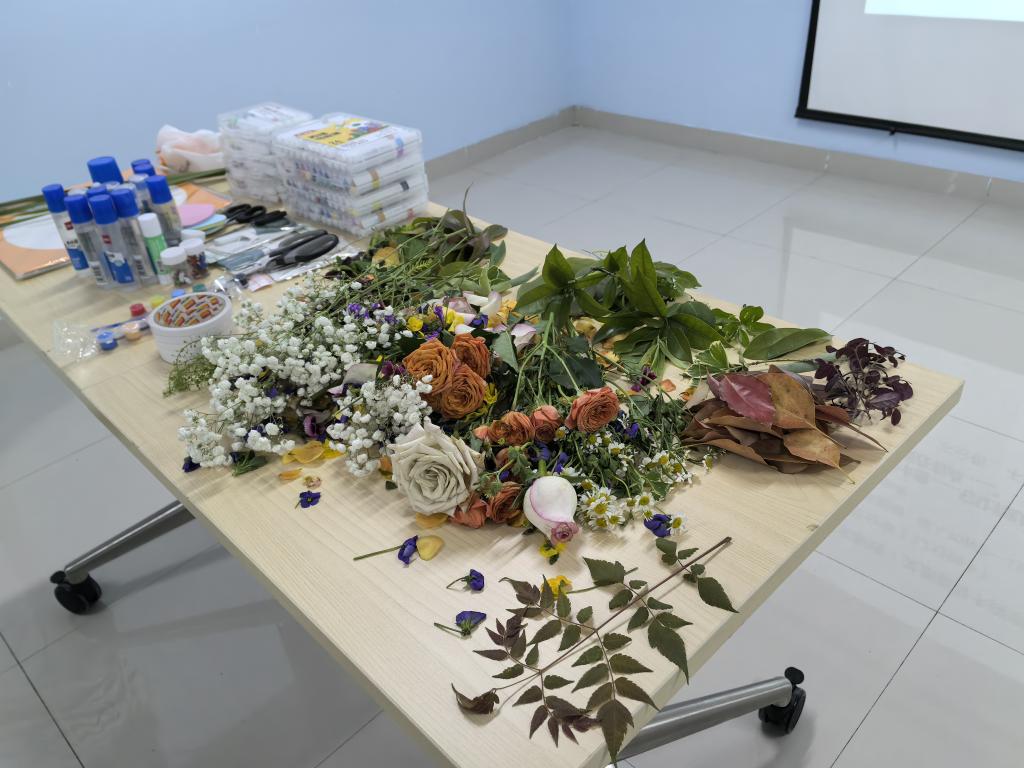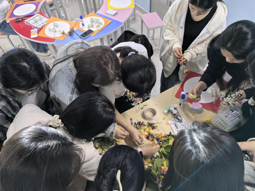 活动现场,玫瑰、满天星等新鲜花草与各类创作工具摆放整齐,同学们在老师指导下,以曼陀罗为基底,结合拼贴、绘画等形式,将春日自然元素融入创作。大家随心创作,在动手过程中卸下负面情绪,与内心深度对话。
