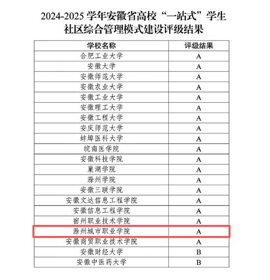 近日,省委教育工委组织开展2024-2025学年安徽省高校“一站式”学生社区综合管理模式建设评级工作。经学校自评、台账审核、专家评审、实地核查、评委会审议等环节,我校“一站式”学生社区综合管理模式建设工作获评A级,为全省3个获评A级的高职院校之一。自2024年省委教育工委开展“一站式”学生社区建设评级工作以来,学校连续两年获评A级等次。