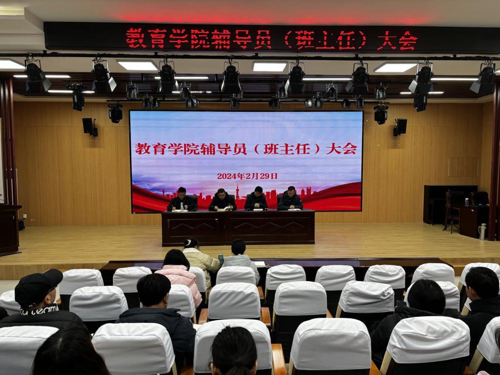 新学期、新征程,为确保新学期学生工作平稳、有序开展,进一步加强辅导员(班主任)工作队伍建设,夯实学生工作基础,提高学生工作实效,2月29日上午,教育学院在报告厅召开新学期全体辅导员(班主任)工作会议。学院党总支书记高国柱、副书记陈立超、学管杨维懂、团总支书记黄正顺以及全体辅导员(班主任)参加会议,此次会议由陈立超主持。会议伊始,杨维懂就新学期学生管理工作做了全面部署安排。一是深入学生宿舍、教室进行...