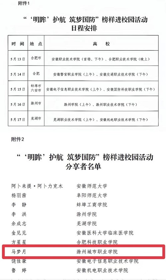 近日,我校优秀退役学子马梦月同学,成功入选由团省委联合安徽省全民国防教育办公室、安徽省学生联合会、安徽省青少年发展基金会组织的“‘明眸’护航 筑梦国防”榜样进校园宣讲团成员。马梦月同学,2018年考入我校医学检验技术专业,同年9月,响应国家号召应征入伍,服役于中国人民解放军火箭军部队,于2023年9月退役复学。复学后,继续发光发热,加入“医”心向党志愿服务队,志愿为滁州革命纪念馆常态化开展爱国主义讲解活动...