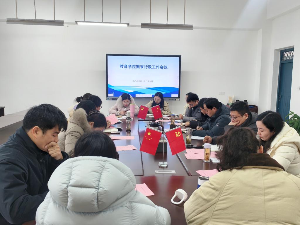 1月29日上午,教育学院在行知楼2202会议室召开期末行政工作会议。学院党总支书记刘亮、副书记陈立超、副院长刘明辉、袁远出席会议,学院全体行政人员及各系主任参加会议。会议由刘亮主持。会议伊始先由学院各部门负责人依次发言,全面总结了2025年度本部门在行政管理、党建思政、教学运行、学生工作、专业建设、技能竞赛、实训管理、社会服务等方面取得的突出成绩与亮点,客观分析了存在的问题与不足,并围绕学院发展大局,汇报...
