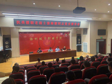 为庆祝中国共产党成立100周年,推动党史、国史、改革开放史、社会主义发展史学习入脑入心,6月7日下午,学院退休职工、原滁州艺校副校长、抗美援朝老战士裴琳蓉同志在图文中心学术报告厅为广大师生做党史报告。学院相关部门负责人,关工委成员、离退休第一支部部分党员、各系部学生入党积极分子共120余人参加了此次报告会。报告会由党委委员、组织人事处处长徐云川主持。裴琳蓉老师现已81高龄。她以参加抗美援朝战争的亲身经历...