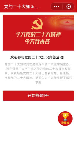 为深入学习宣传贯彻党的二十大精神,进一步推动党的二十大精神进校园,更好地团结引领全校青年学生永远跟党走,奋进新征程,滁州城市职业学院举办了“学习党的二十大,启航向未来”党的二十大知识竞赛。竞赛由校团委主办,医学院、学生处、马克思主义学院共同承办,全校共有3970名学生参加,经过激烈角逐,100名学生脱颖而出!此次党的二十大知识竞赛既是对前期学习成效的集中检验,又是对今后继续加强学习的有力鞭策,通过知识...