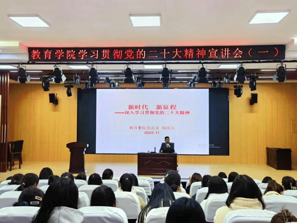 为深入宣传党的二十大精神,在广大师生中掀起学习领悟党的二十大精神热潮,11月17日下午4:20,教育学院在报告厅开展题为“新时代、新征程”的党的二十大精神专题宣讲活动。本次宣讲是教育学院学习贯彻党的二十大精神系列活动的首场活动。由教育学院党总支书记钱庆兵主讲,教育学院120名入党积极分子、学生干部和专职辅导员参会。钱庆兵从牢牢把握党的二十大的鲜明主题、深刻认识党的二十大的重大意义、深刻领悟党的二十大的教育...
