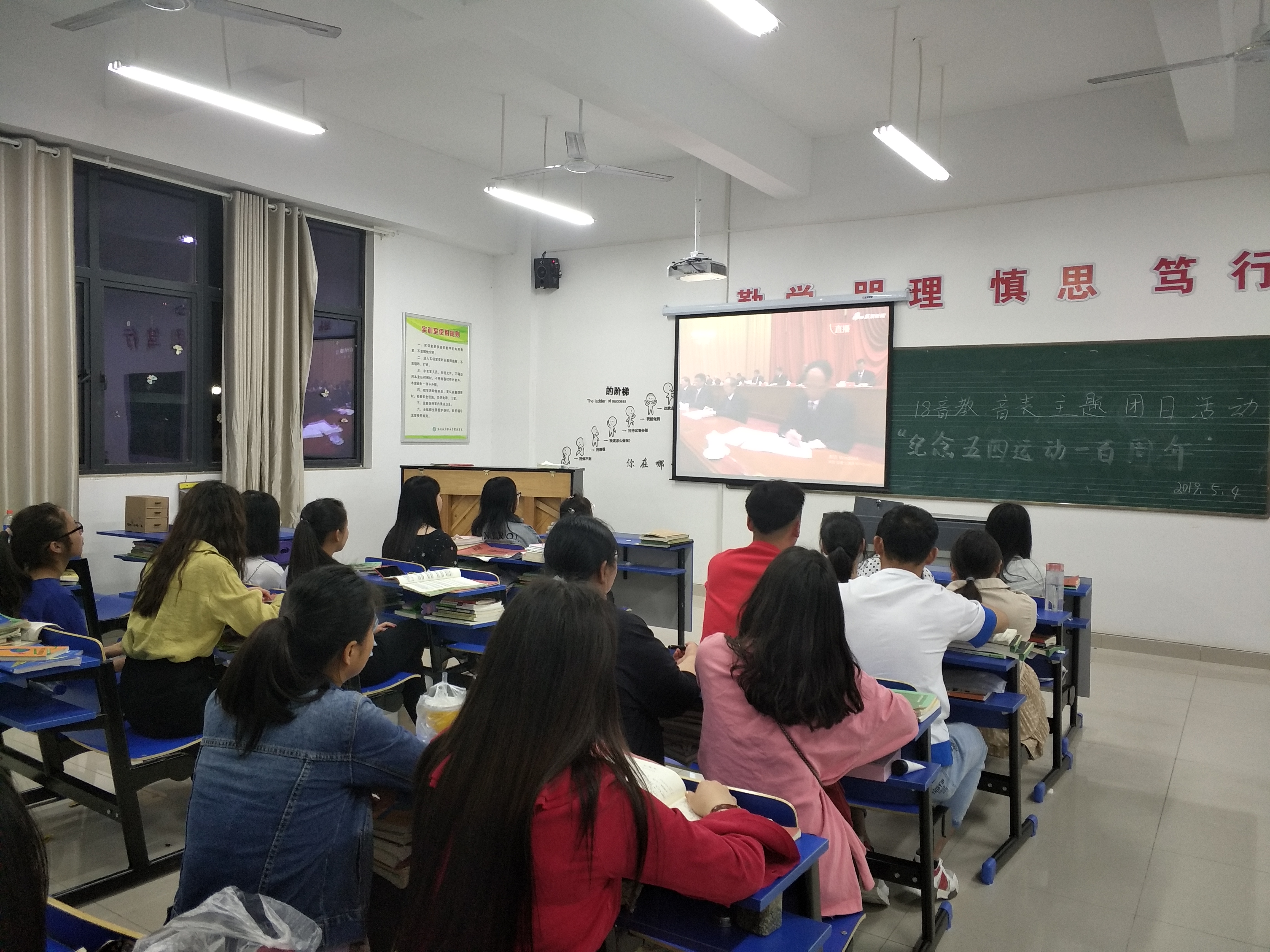 5月4日晚自习,艺术系团总支集中组织全系各团支部,学习习近平总书记在纪念“五四”运动100周年重要讲话,学习采取观看视频形式。