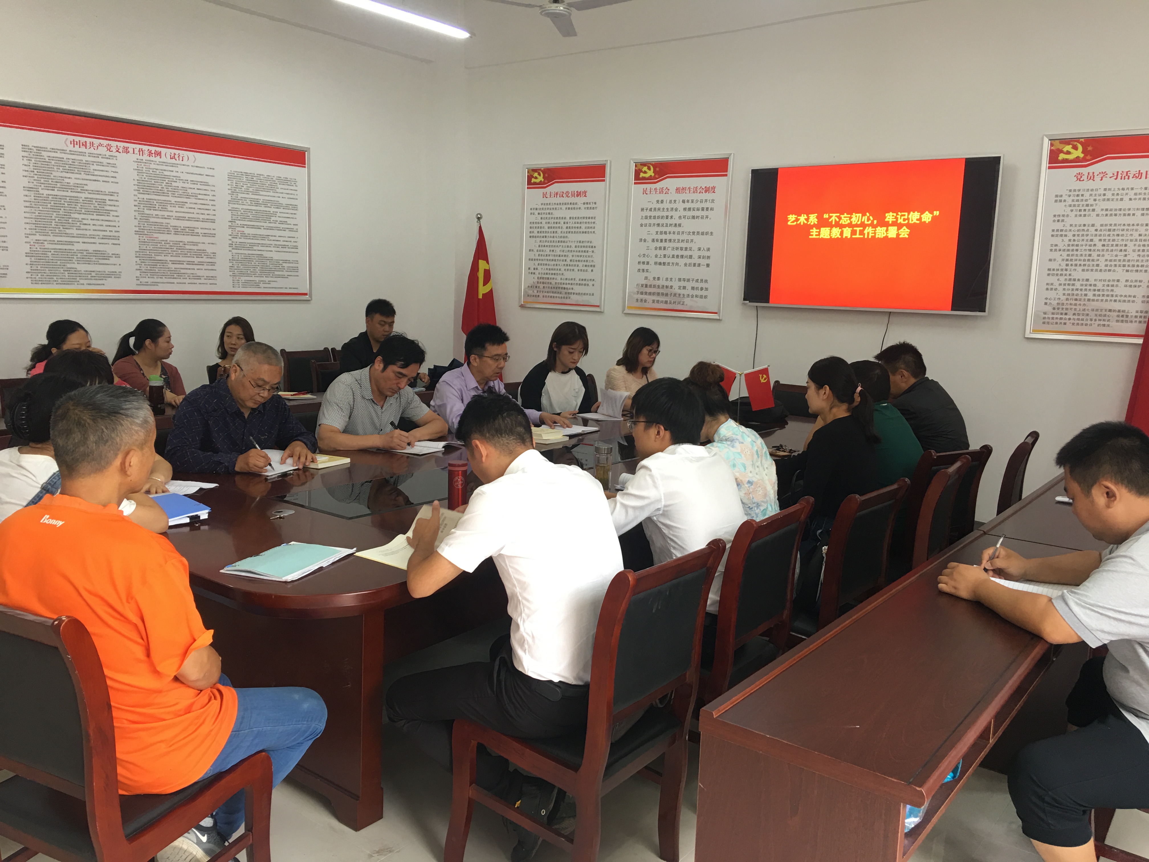 9月20日上午,艺术系党总支在C2南114室党员活动室召开“不忘初心、牢记使命”主题教育宣传动员会议。会议由艺术系党总支书记杨孝富主持,艺术系全体党员和入党积极分子参加了会议。