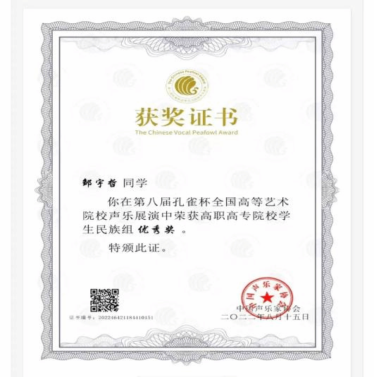 8月9日至8月15日 ,第八届“孔雀杯”高等艺术院校声乐展演暨第六届高校声乐学术交流活动在宁波大学举行。我院由两名教师和一名学生参加本次“孔雀杯”的展演,2021级音乐表演专业邹宇哲同学进入总展演,并获得高职高专院校学生民族组优秀奖。