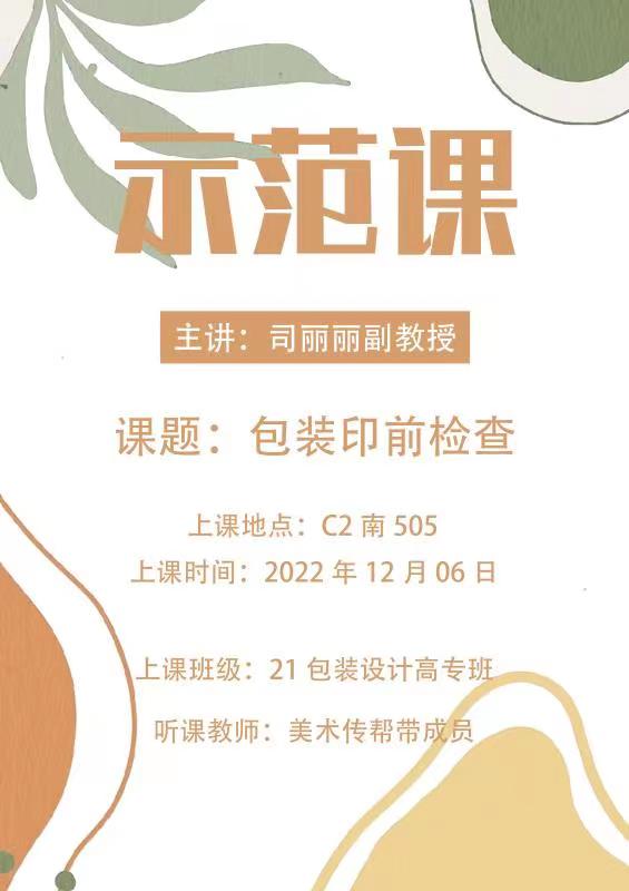 为提升青年教师的教育教学能力,发挥老教师在课堂教学、教学科研方面的示范辐射作用 。12月06日美术传帮带团队司丽丽副教授,在C2南505教室以《包装印前检查》为题,为青年教师示范授课。