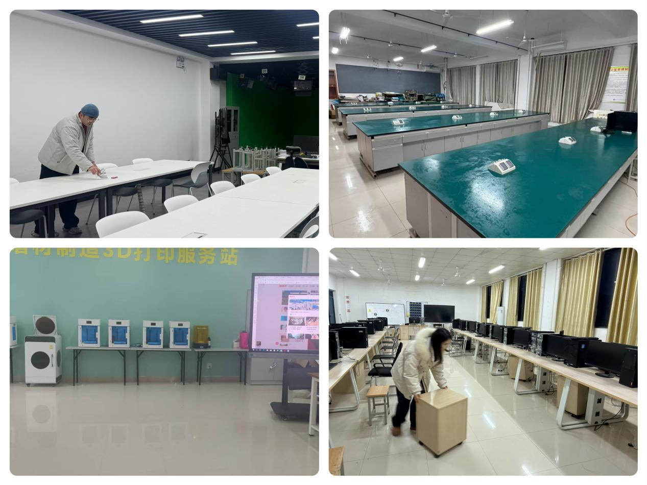 活动中,教师们分工协作、细致入微。大家手持清洁工具,对实训室内的地面、操作台进行清扫,清理卫生死角,同时排查安全隐患,对实训设备规范归置,确保设施设备完好可用。经过一番辛勤劳作,各实训室窗明几净、物品齐整,呈现出焕然一新的面貌。践行了“茅檐长扫净无苔,花木成畦手自栽”的整洁理念。