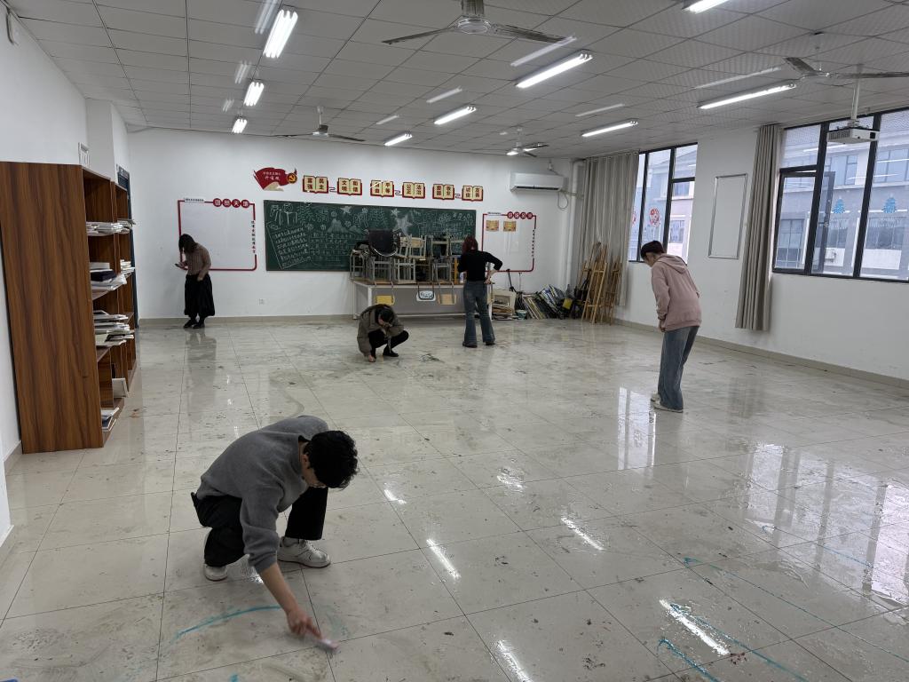 下午,参与活动的师生在德馨楼三楼集合。王荣荣作动员讲话,强调本次活动既是落实“三会一课”制度的具体实践,也是推动党建与业务深度融合、构建“三全育人”格局的重要举措。她指出,美术教育专业学生日常创作中使用的油画颜料、画具等物品容易造成教室环境污染,维护教学场所整洁是每一位师生的责任,党员教师更应以身作则、率先垂范。随后,师生分组对德馨楼301、302、303、304、308共5间教室进行了全面清扫整理。活动中,党员教师与同学们分工协作、默契配合:地面清洁组:针对美术教室特有的油画颜料污渍、铅笔屑、橡皮碎屑等,使用专业清洁剂进行深度清理,恢复地面本色;物品整理组:将散落的画具、静物台、储物柜等物品分类归位,规范摆放教学器材;