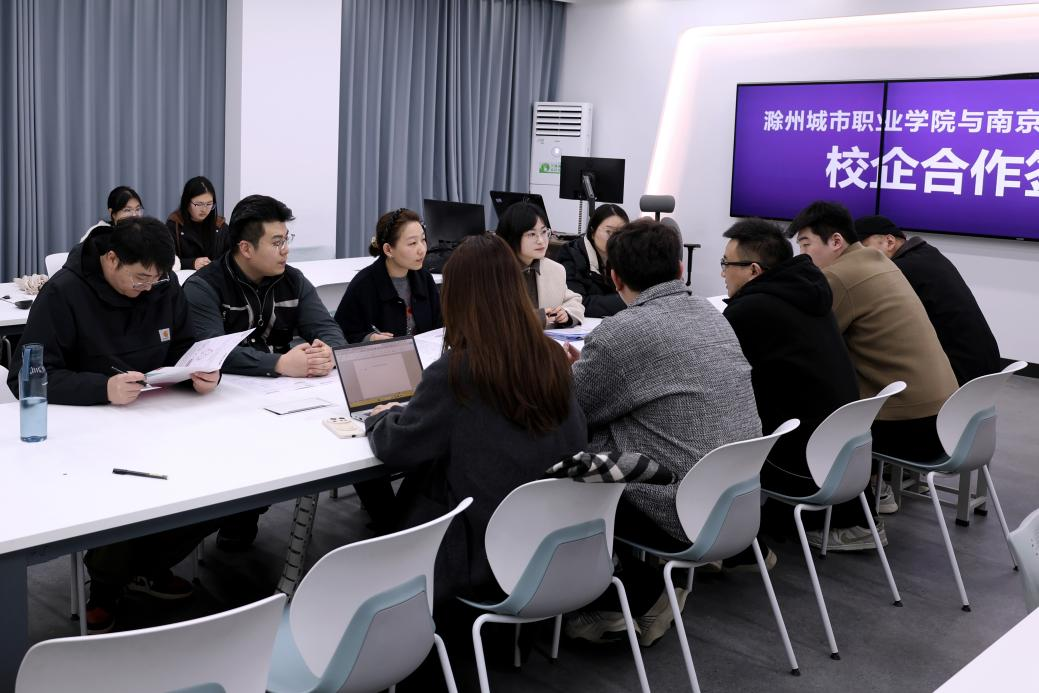 2026 年 3 月 18 日,滁州城市职业学院与南京落尘文化传媒有限公司校企合作,签约仪式在艺术与传媒学院专业实训场地隆重举行。本次活动汇聚校企双方核心骨干力量,学院相关负责人积极与企业方相关负责人进行探讨人才培养,各方齐聚一堂,共商产教融合育人新路径。