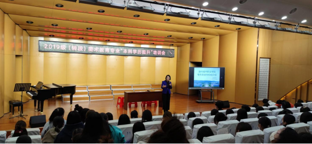 2022年10月26日下午,我院在音乐厅举行2019级(转段)美术教育专业“本科学历提升”培训会。会议由院长钱中宝主持,出席本次活动的有学校继续教育学院院长许梅、艺术与传媒学院党总支副书记汪勇、美术教育专业负责人刘晓玲老师。