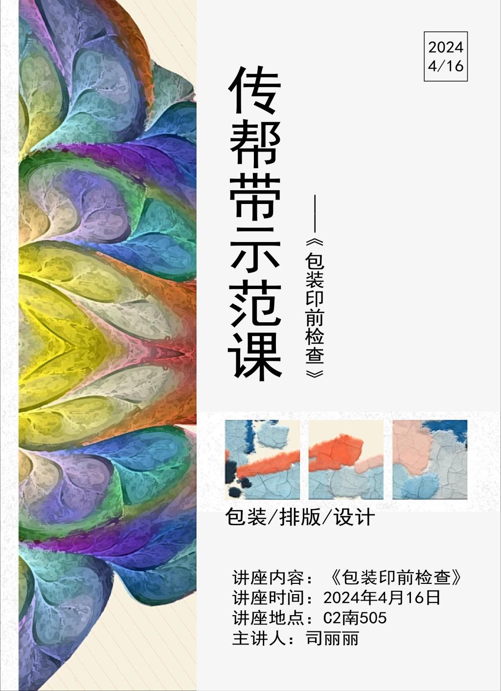 一年来设计系新进了一批青年教师,为加强教师队伍建设,培养一批高素质、高水平的青年教师,真正发挥骨干教师“传、帮、带”的示范引领作用。4月16日上午8点美术传帮带团队成员司丽丽副教授,在C2南505教室以《包装印前检查》为题,为青年教师示范授课。