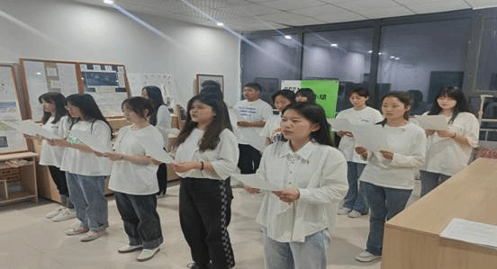 首先,各班团支部书记带领支部团员学唱团歌,团员们将团徽佩戴胸前,齐声高唱团歌《光荣啊,中国共青团》。“我们是五月的花海,用青春拥抱时代,我们是初升的太阳,用生命点燃未来……”。伴随着音乐,同学们激情澎湃、热情高涨、清脆响亮的歌声,回荡在学院每一个角落。