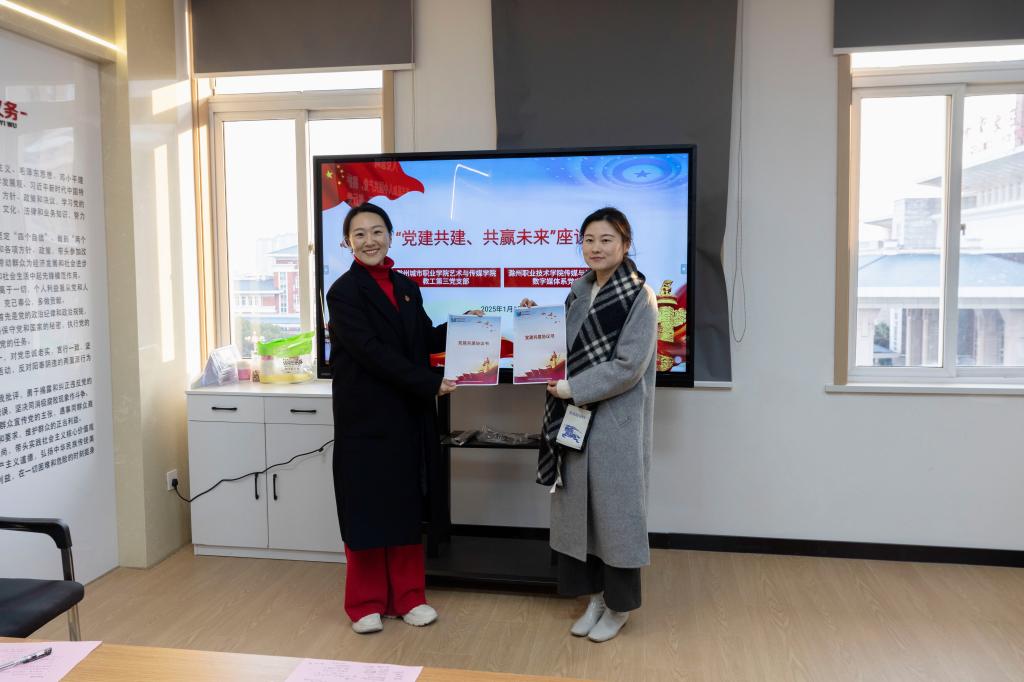 为深入贯彻落实党的二十届三中全会精神,发挥“党建+”政治引领作用,促进地方高校基层党组织之间资源共享、优势互补,1月8日下午,滁州城市职业学院艺术与传媒学院教工第三党支部与滁州职业技术学院传媒与设计学院数字媒体系党支部,在滁州职业技术学院4501党员活动室,举办以“党建共建,共赢未来”为主题的基层党组织交流活动。