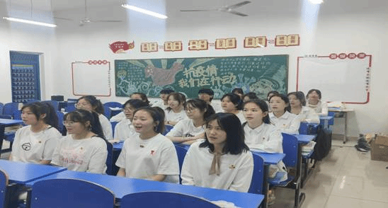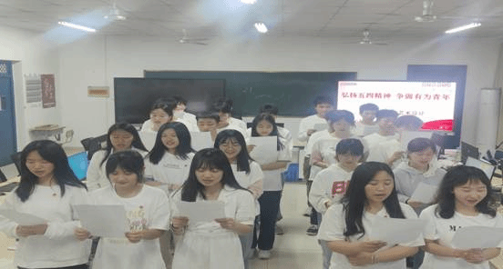 首先,各班团支部书记带领支部团员学唱团歌,团员们将团徽佩戴胸前,齐声高唱团歌《光荣啊,中国共青团》。“我们是五月的花海,用青春拥抱时代,我们是初升的太阳,用生命点燃未来……”。伴随着音乐,同学们激情澎湃、热情高涨、清脆响亮的歌声,回荡在学院每一个角落。