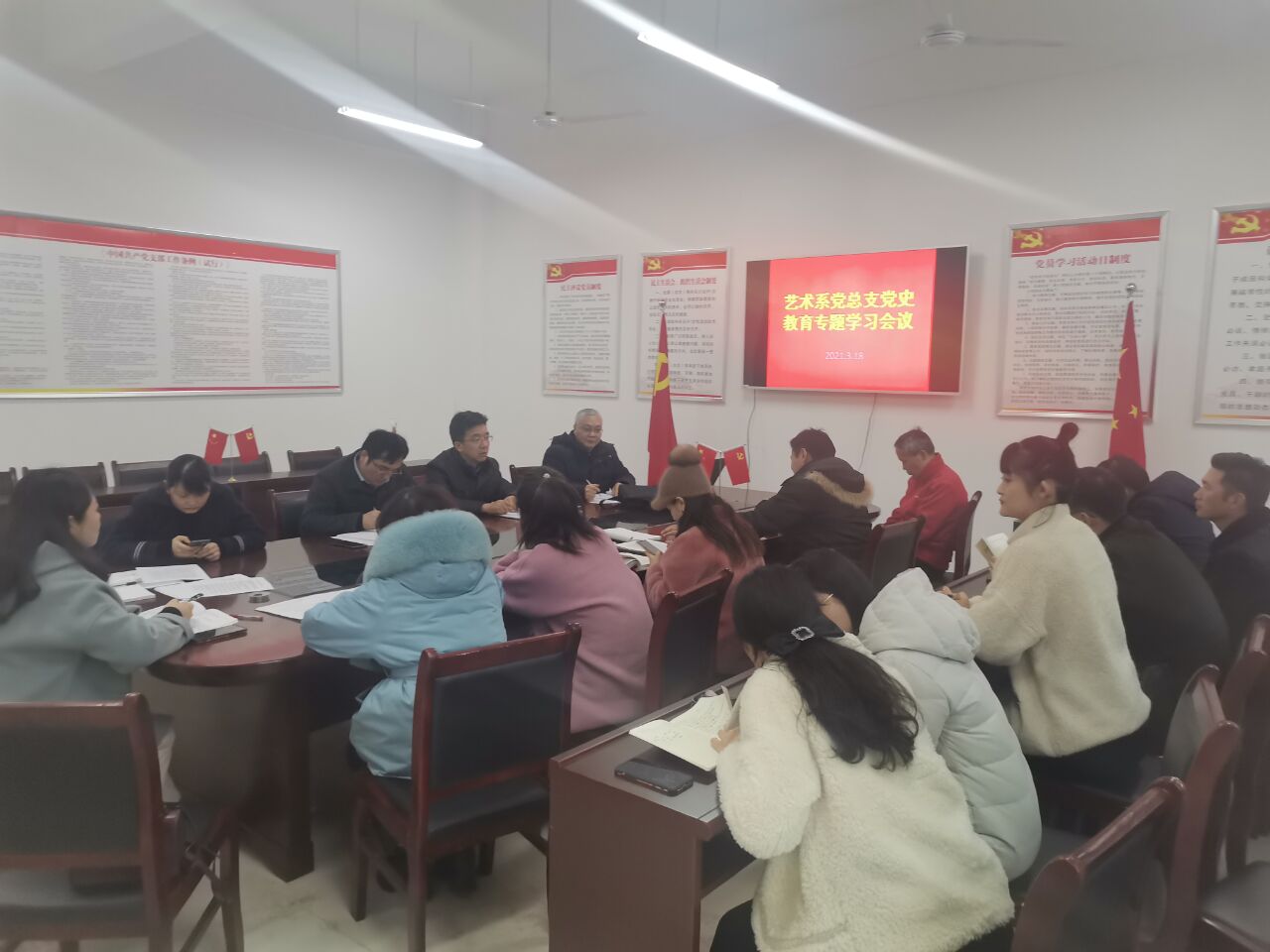 3月18日下午艺术系党总支在党员活动室召开党史学习教育专题学习会议,艺术系全体党员及入党积极分子参加了会议,会议由艺术系党总支书记杨孝富主持。