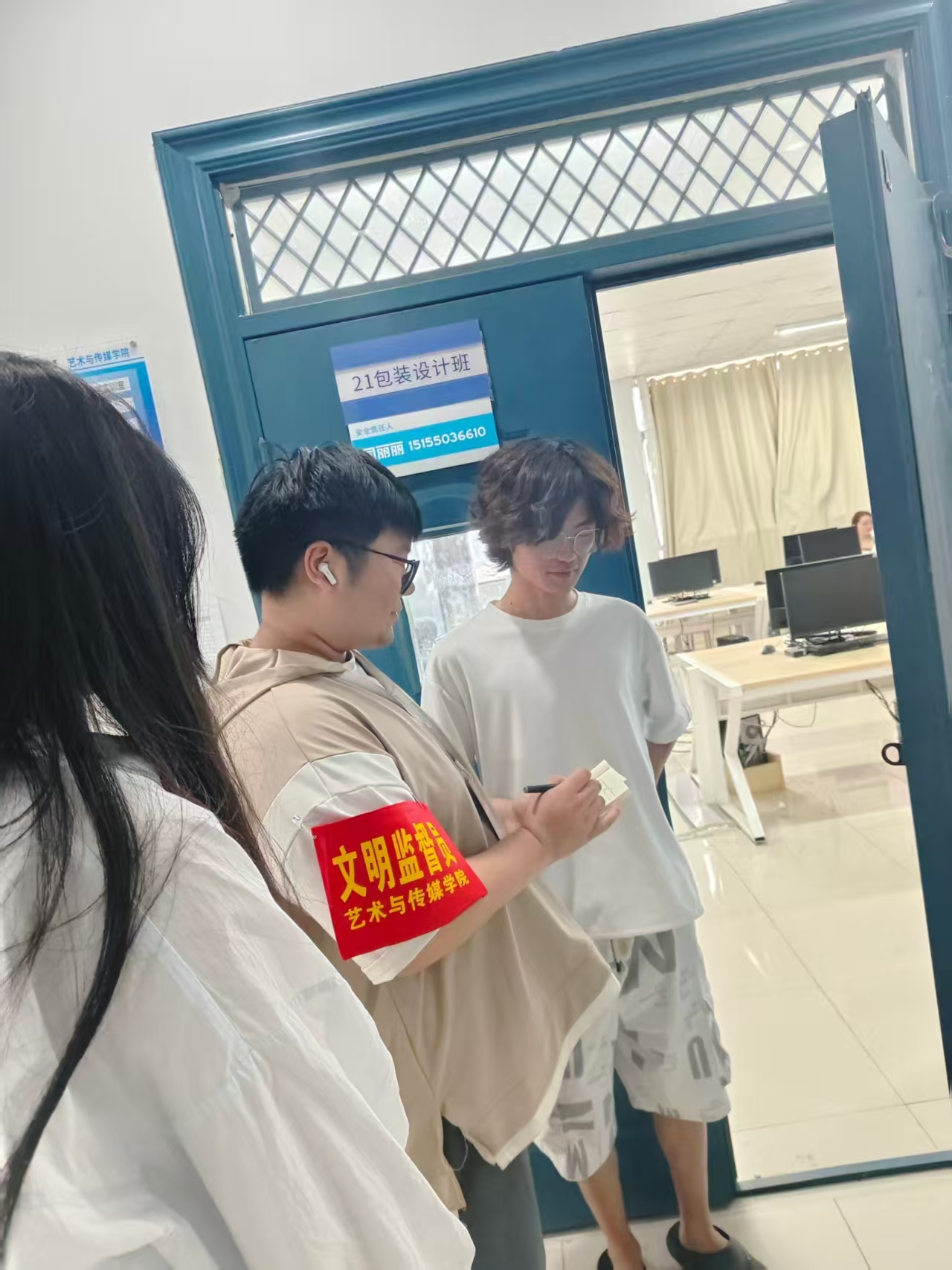 为进一步强化学生文明意识,规范日常行为习惯,营造和谐有序育人环境,近期,艺术与传媒学院开展“学生行为规范整治月”活动,在学院门厅、办公区、实验室等处,设立师生文明监督岗,以专项整治为抓手,全面推进校园精神文明建设。