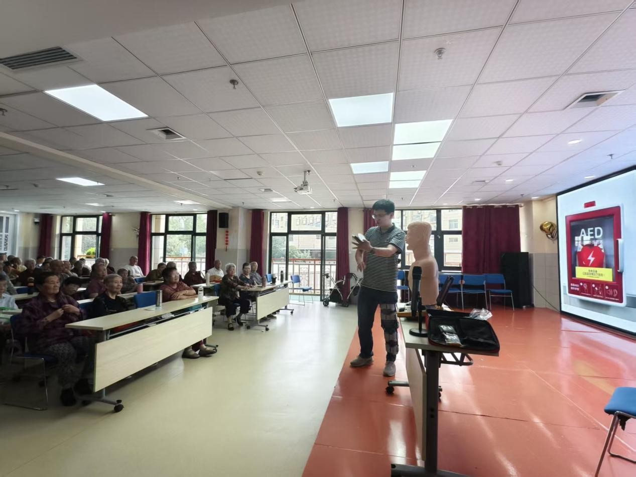 针对老年人的生理特点和生活常见风险,讲座重点讲解了三大核心急救技能。谢老师首先详细阐述了如何快速识别呼吸心跳骤停这一“黄金4分钟”内的关键征兆。随后,现场直观演示了心肺复苏(CPR)的标准操作流程,并重点介绍了自动体外除颤器(AED)的简易使用步骤,化解了老人们对于复杂设备的畏惧心理。最后,针对老年人易发生的呼吸道异物堵塞情况,谢老师通过生动的案例和分解动作,深入浅出地教授了海姆立克急救法的操作要领。