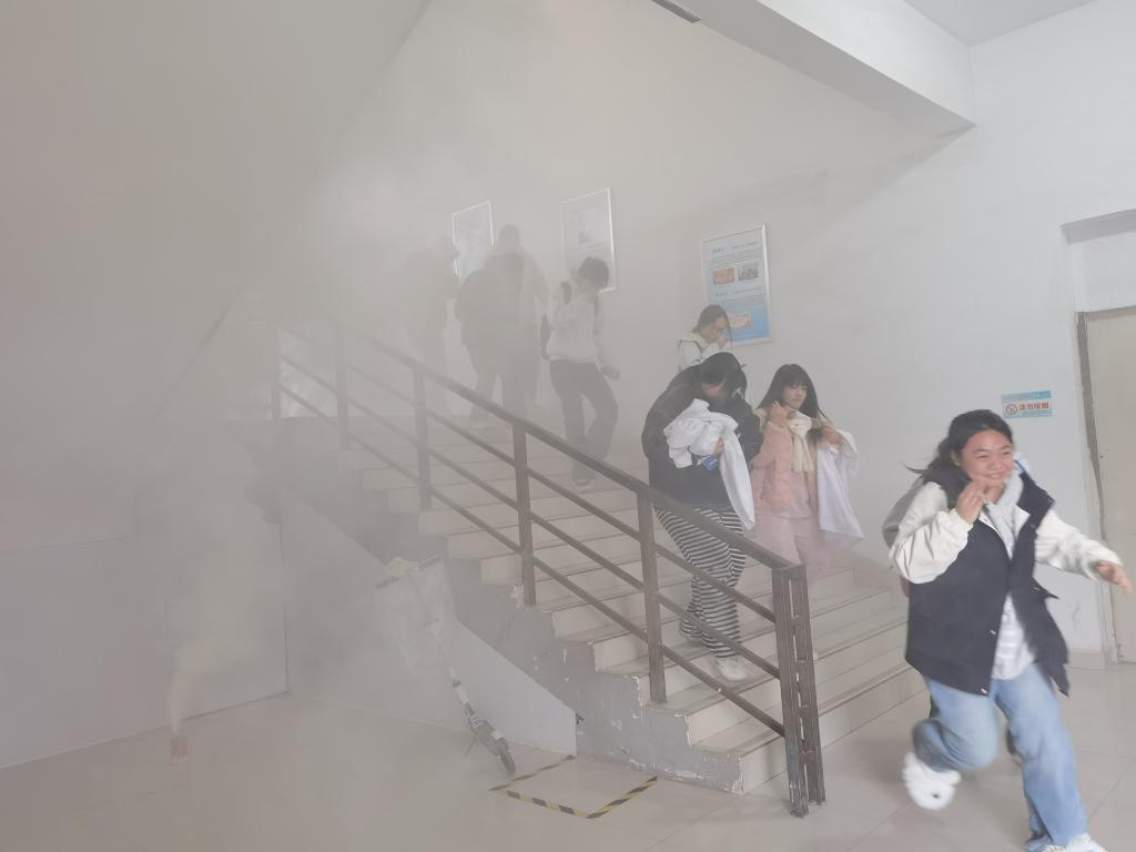 在辅导员及班级干部的组织下,同学们迅速放下手中书本,用湿纸巾捂住口鼻,弯腰低姿,按照“就近疏散、不推不挤”的原则,从教室有序撤出。疏散过程中,师生们严格遵循预定路线,避开楼梯转角等关键节点,快速向指定的东边停车场或北边车棚集结。现场工作人员全程巡查,及时提醒疏散规范,保障通道畅通。