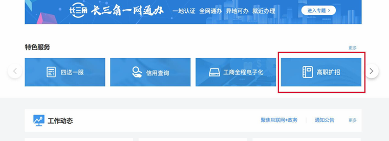 4. 登录后在网页中下部找到“特色服务”栏目,点击“高职扩招”即可进入高职扩招报名信息填写页面。