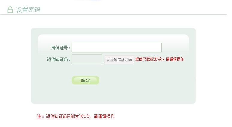 输入身份证号,点击“发送短信验证码”按钮后,系统会随机发送6位数字验证码至考生报名时所填的手机号上(即在安徽政务服务网上注册时填写的手机号码);填写完短信验证码,点击“确定”,跳转至考生修改密码页面,设置考生登录密码。短信验证码只能发送5次,请勿短时间重复发送验证码。