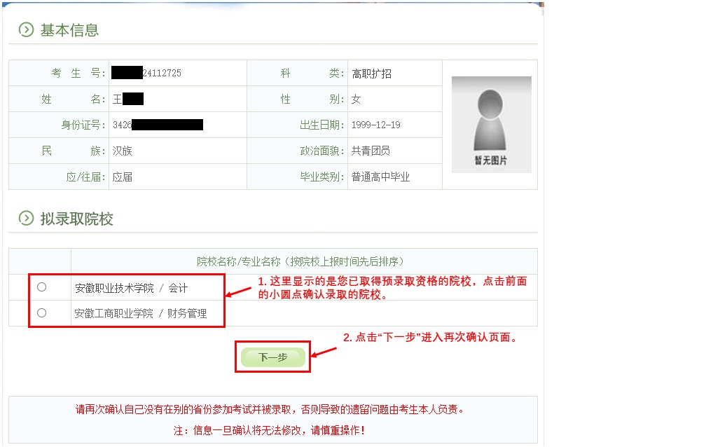 Ø 一旦确认了录取院校,是不能再次修改的,请谨慎操作!!!